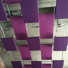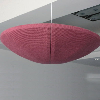 空間吸聲體具有重量輕、吸聲效率高、布置靈活、施工簡單等特點(diǎn)。由于懸空掛置,聲波可以從不同角度入射到吸聲體,所以其吸聲效果比貼附在剛性壁面上更好。根據(jù)聲源特性、裝飾要求可制作成板狀、塊狀、圓柱形、圓錐形、球形、金字塔形等,還可以懸掛成一定的圖案,并與采光、照明、裝修等互動配合,視覺效果更好??臻g吸聲體所使用的吸聲材料通常采用超細(xì)玻纖吸聲棉外包玻璃絲布或者更加環(huán)保的密胺棉(可外包PVF膜)等材料。懸掛方式可以水平分散吊掛也可以垂直分散吊掛,還可以水平垂直復(fù)合式吊掛。在室內(nèi)表面吸聲系數(shù)很低,反射聲較多、室內(nèi)混響時間較長的情況下,懸掛空間吸聲體后一般獲得5~8dB的降噪效果,最高可達(dá)10~12dB??臻g吸聲體廣泛適用于體育場館、大面積多聲源高噪聲的車間,也可用于演播室、錄音室、演播廳、影劇院、圖書館、會議室等聲學(xué)要求較高的場合。