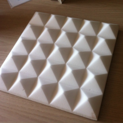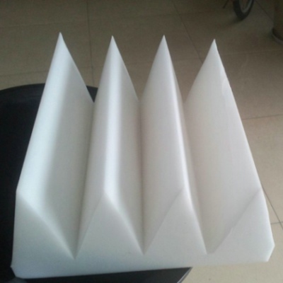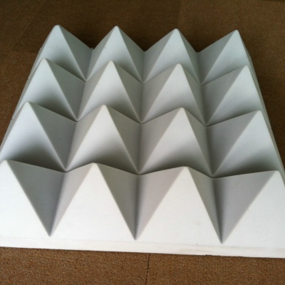三聚氰胺棉(密胺棉)是一種優(yōu)良的多孔吸聲材料,因其海綿狀,可切割加工成包括尖劈在內(nèi)的各種形狀。三聚氰胺尖劈重量輕,安裝方便,聲學(xué)效果好。其缺點(diǎn)是直接裸露使用容易積灰且不易清潔,而且相對紗網(wǎng)和金屬尖劈其強(qiáng)度明顯不足,受碰撞易損壞。
